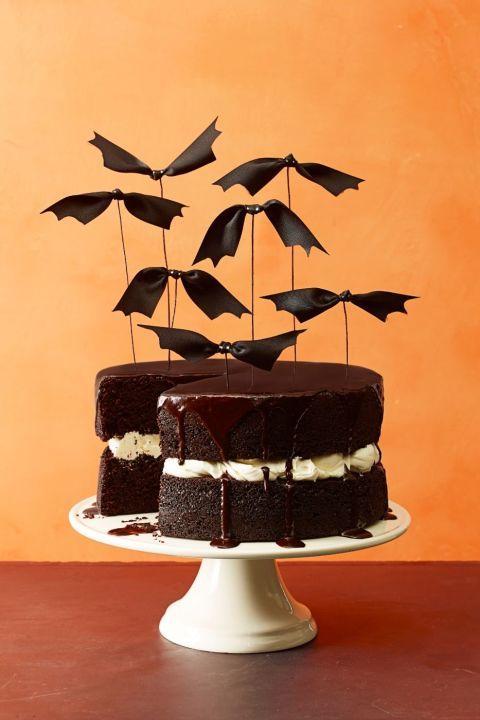 یک کیک اسفنجی را با اضافه کردن پودر کاکائو به ترکیبات اولیهاش به رنگ تیره درآورید و رویش را به همان سادگی که در تصویر میبینید با گره زدن روبان های مشکی به شکل خفاش بر روی پایه های چوبی یا نی تزیین کنید.
