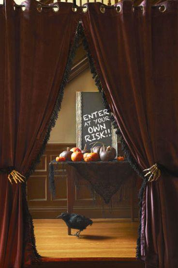 اولین لحظات رویارویی با هر چیزی پیش فرضهای ذهنی ما را در مقابل چیزی که قرار است با آن مواجه شویم شکل می دهد. یک ورود هیجان انگیز معنای یک مهمانی مهیج را تداعی میکند! تصور کنید چه میشود اگر مهمانان در اولین لحظه ورود با منظرهای ترسناک مواجه شوند. پس دست به کار شوید و خلاقیتتان را به کار بیاندازید. نمونهای که در عکس میبینید یک ایدهی ساده و قابل اجراست. یک پرده ساده ترجیحاً قرمز یا مشکی تهیه کنید و آن را با دستهای اسکلتی و عنکبوت و خفاش تزیین کنید. روی کاغذ یا یک تخته سیاه عبارات ترسناک مثل "خطر مرگ"، "مسؤلیت خطرات به عهده خودتان است" یا "هیچکس زنده بیرون نمیرود" و... بنویسید.