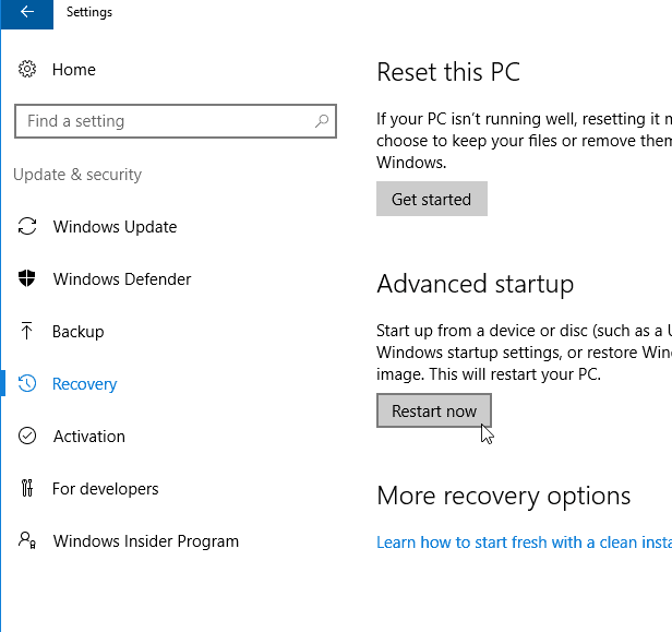 در ویندوز ۱۰ اپ Settings را با کلیک کردن روی آیکون چرخدندهایشکل آن در منوی استارت اجرا کنید. مسیر Settings > Update & security > Recovery را طی کنید و در بخش Advanced start-up گزینهی Restart now را کلیک کنید تا سیستم ریاستارت شود و منوی Advanced Start-up یا استارتآپ پیشرفته نمایان شود.