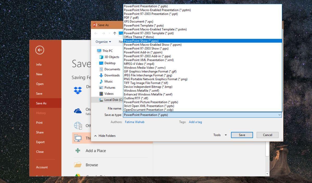 ابتدا محلی که میخواهید فایل ارائه در آنجا ذخیره شود را انتخاب کنید و سپس در کادر مربوط به Save as Type یکی از گزینههای PDF یا PPSX را انتخاب کنید. توجه داشته باشید که فایل PPTX که فایل اصلی میباشد همچنان میتواند ویرایش شود و بابت این موضوع نیازی به نگرانی نخواهید داشت.