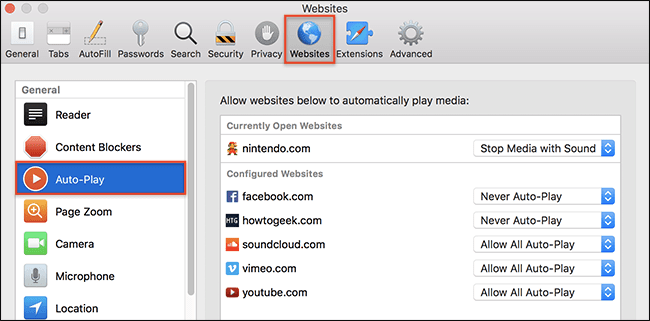 اخیراً در بروزرسانیهای جدیدی که برای سیستم عامل مکاواس ارایه شده، مرورگر سافاری قابلیت جدیدی پیدا کرده و تقریباً تمام ویدیوهایی که به صورت خودکار شروع به پخش شدن میکنند را مسدود میکند. اما میتوان سایتهای خاصی مثل یوتیوب و آپارات و ... را مجاز فرض کرد.