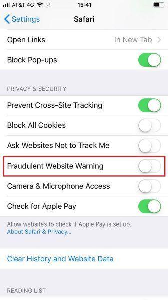 اکثر سایتهای بزرگی که شما همه روزه به آنها سر میزنید، امن هستند. با این حال، اینترنت پر از سایتهای خطرناک است که آماده تزریق نرمافزارهای مخرب روی دستگاه شما هستند. ویژگی هشدار سافاری درباره مخرب بودن سایت، درباره ناامن بودن سایتی که وارد آن میشوید، هشدار میٔدهد. دلیل خاصی برای اینکه این هشدار را غیرفعال نگه دارید وجود ندارد. برای فعال ساختن آن مسیر Setting > Safari > Privacy and Security را دنبال کنید و سپس گزینه Fraudulent Website Warning را روشن کنید.