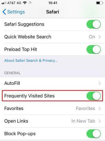 یکی دیگر از ویژگیهای بارز مرورگرها، نمایش سایتهایی است که توسط کاربر بیشترین بازدید را داشتهاند؛ این ویژگی نیز به صرفهجویی در زمان برای گشت زدن در اینترنت کمک میکند. اگرچه شاید برای خیلی از سایتها مثل سایتهای خبری این ویژگی ضرری نداشته باشد، اما خوب در سایتهایی که شما در آنها اطلاعاتی مانند نام کاربری، رمز عبور و یا حتی اطلاعات کارتهای اعتباری خود را وارد کردهاید، وجود چنین ویژگی میتواند به ضرر شما تمام شود. برای غیرفعال کردن آن باید مسیر Setting > Safari > General را دنبال کنید و سپس گزینه Frequently Visited Sites را غیرفعال نمایید.