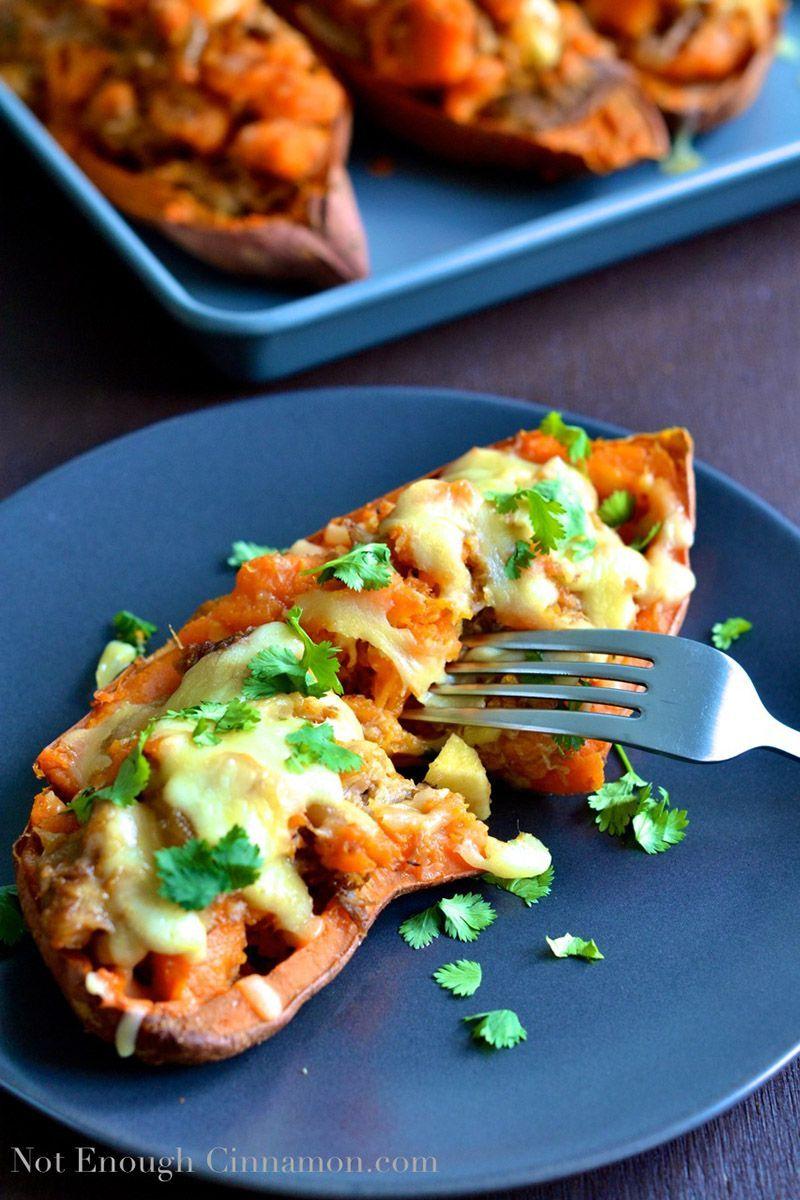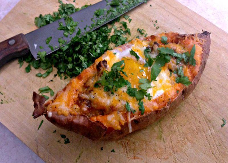 ماهیتابه را از روی حرارت بردارید و گشنیز خرد شده را به آن اضافه کنید. روی سیبزمینیهای پخته را از طول طوری برش بزنید که مانند یک کاسه یا قایق شود و به کمک یک قاشق کوچک مقداری از بافت سیبزمینی را خارج کنید تا امکان ریختن مواد پُر کننده وجود داشته باشد. مقداری از مواد را در حفرهی سیبزمینی بریزید و وسط آن را گود کرده و یک تخم مرغ وسط آن بشکنید و روی تخممرغ هم مقداری از پنیر پیتزا بریزید. سیب زمینیهای آماده شده را با احتیاط در سینی فر قرار دهید و در حدود ۱۵ دقیقه در فر بگذارید تا سفیدهی تخممرغ خودش را بگیرد و پنیر هم آب شود.