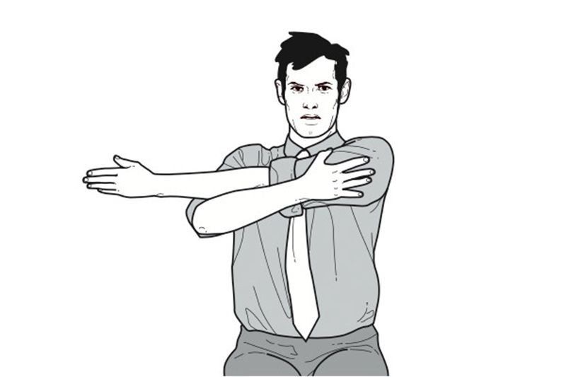 با همین حالت به آرامی دستها را به بالای سر برده و تا جایی که ممکن است به بالا کشیده و برای ۱۰ ثانیه نگه دارید. به حالت اول بازگردید. دست چپ را از بالا و کنار گردن بر روی پشت شانه خم کنید. کف دست راست را بر روی آرنج دست چپ گذاشته و آنرا به آرامی به سمت عقب هل دهید و برای ۸ تا ۱۰ ثانیه در وضعیتی که راحت هستید بمانید. این حرکت را با دست دیگر نیز تکرار کنید.